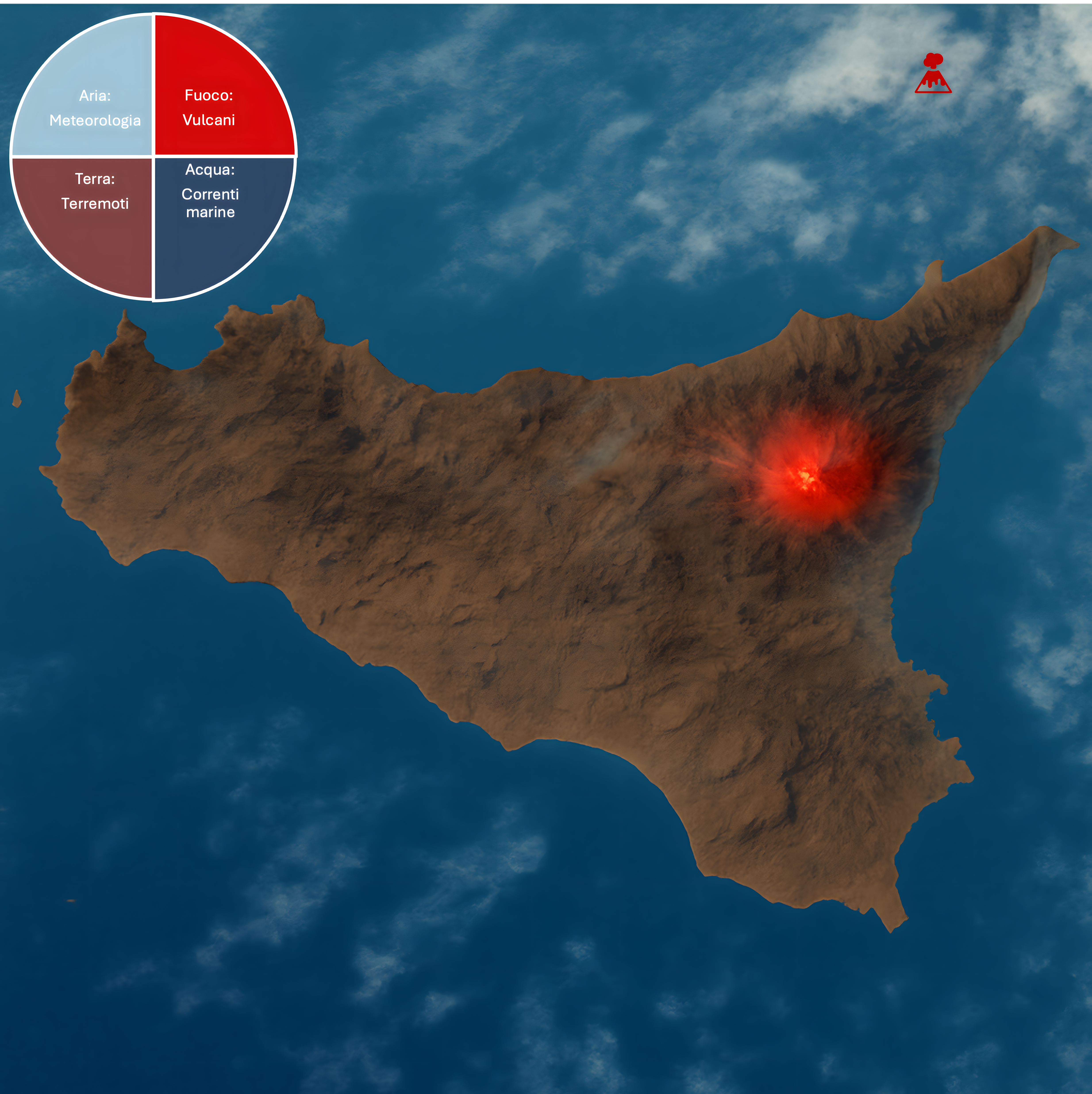 Al centro del Mediterraneo, la Sicilia appare come un crocevia di energie naturali: terra che vibra, aria che muta, acque che si incontrano e fuoco che emerge dalle profondità. In nessun altro luogo, forse, la Natura rivela con tanta intensità la propria architettura elementare. Non sorprende che Empedocle di Akragas (V sec. a.C.), uno dei primi filosofi-scienziati dell’Occidente, abbia visto proprio in questo scenario la manifestazione viva delle forze che generano il mondo. Per lui tutto ciò che esiste - dai minerali ai viventi, dai fenomeni atmosferici ai mutamenti geologici - nasce dalla mescolanza e separazione di quattro principi eterni: Terra, Acqua, Aria e Fuoco.