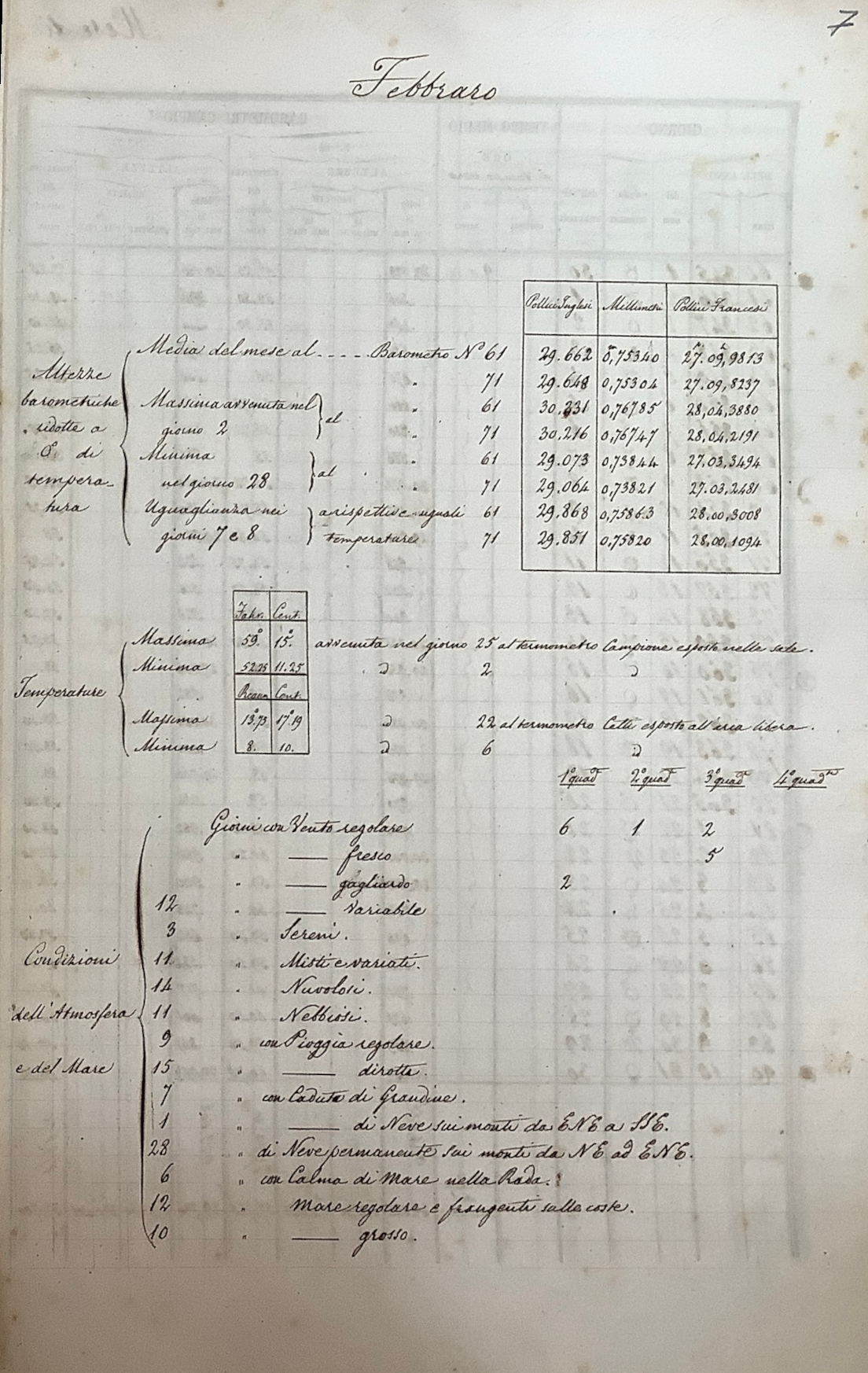 pollici inglesi, mentre le temperature erano misurate in gradi Fahrenheit e Reamur. I dati erano