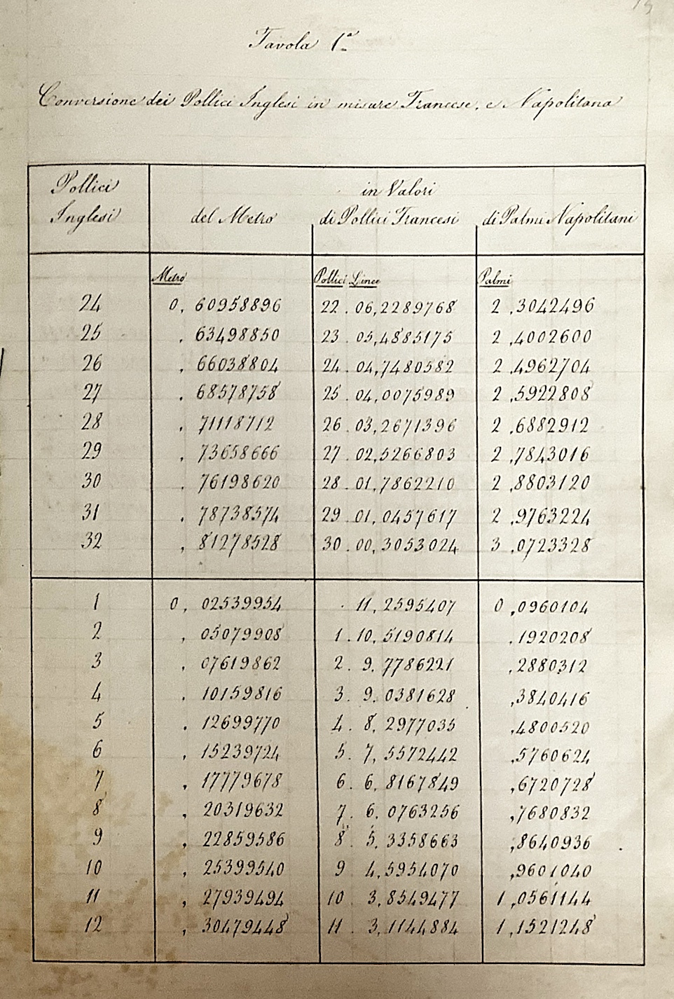 conversione da pollici inglesi in unità francesi e napoletane (fig. 1), e da gradi Reamur e
